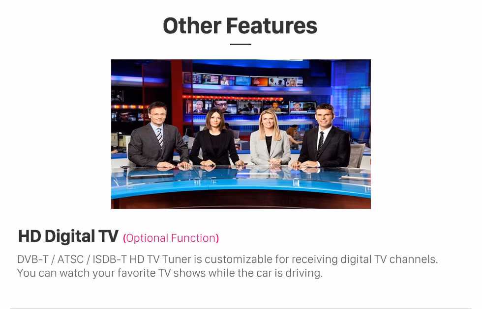 - Sintonizador de radio: Este sistema A/V para coche, integrado con un potente sintonizador de radio FM/AM digital, ofrece búsqueda automática, manual y almacenarlos en el proceso. También se admite RDS.